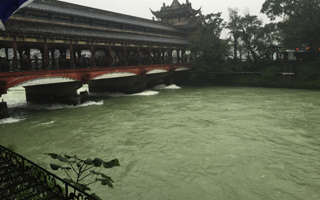 In a neighbouring city of Chengdu called Dujiangyan is on of the oldest dams in the world. I went with Prof. Wentong Cai, Prof. Simon Taylor and Robson de Grande to have a look at this touristic attraction. The weather was said to be rainy, but I somehow forgot to bring an umbrella. This meant we went to buy one and this was a good idea. Since it started drizzling when we left from the parking lot, we thought it won’t get any worse. But half way through the 2.5 hour long track to the dam, it started to rain very heavily. The rain, other than Singaporean rain, didn’t stop after a couple of minutes. Nonetheless, we continued our walk. Since we’re already wet, it didn’t make a difference. Along the way, there were several gates and shrines where we sought refuge from a rain for a couple of minutes.