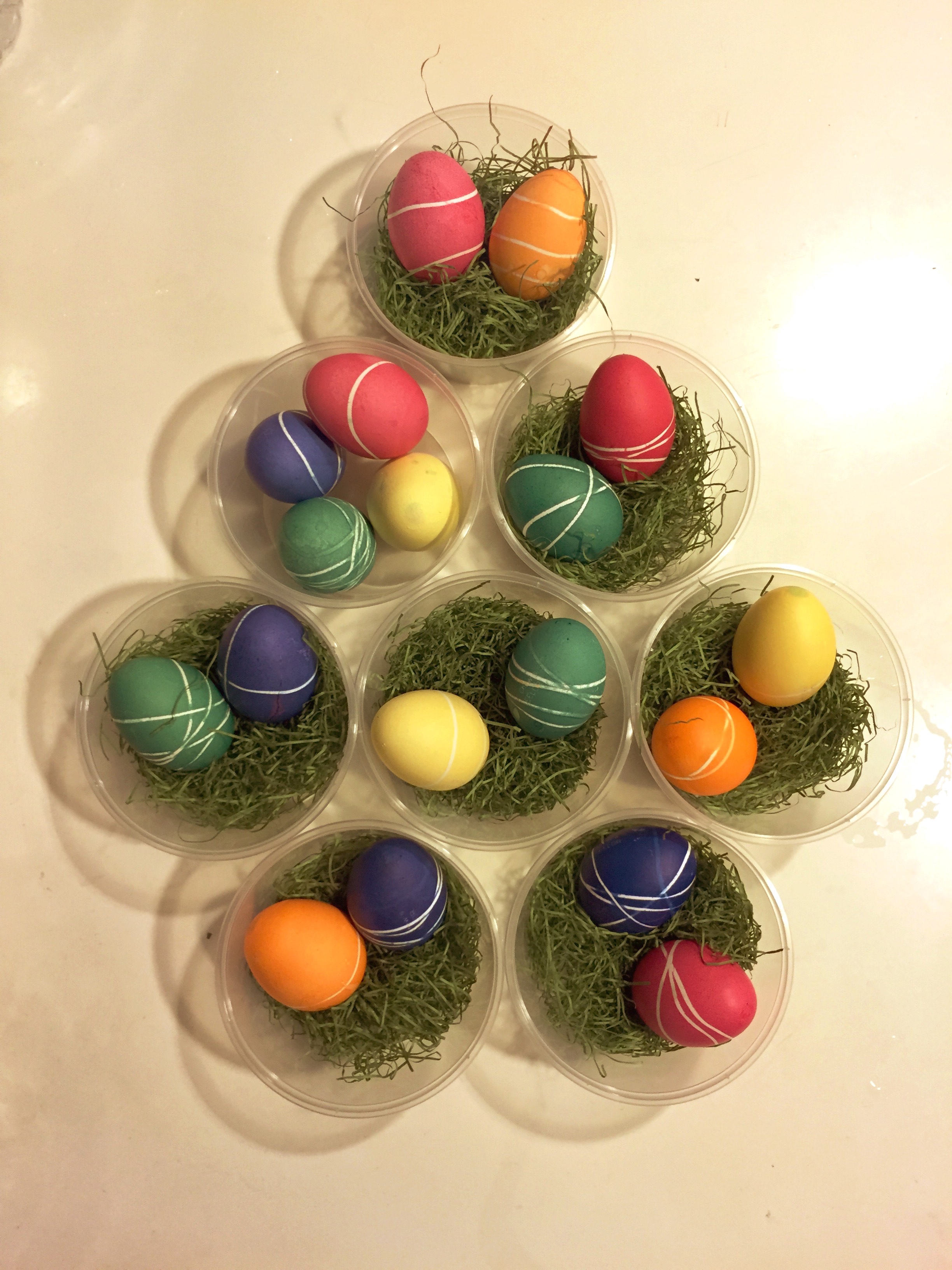 Ich hatte mich dazu entschieden kleine Ostergeschenke zu verteilen und habe kleine Schüsseln mit Ostergras ausgestattet und die fertigen Eier dort gebettet. Zusätzlich gab es noch etwas Schokolade. Diese bitte erst nach dem vollständigen erkalten der Eier dazugeben.