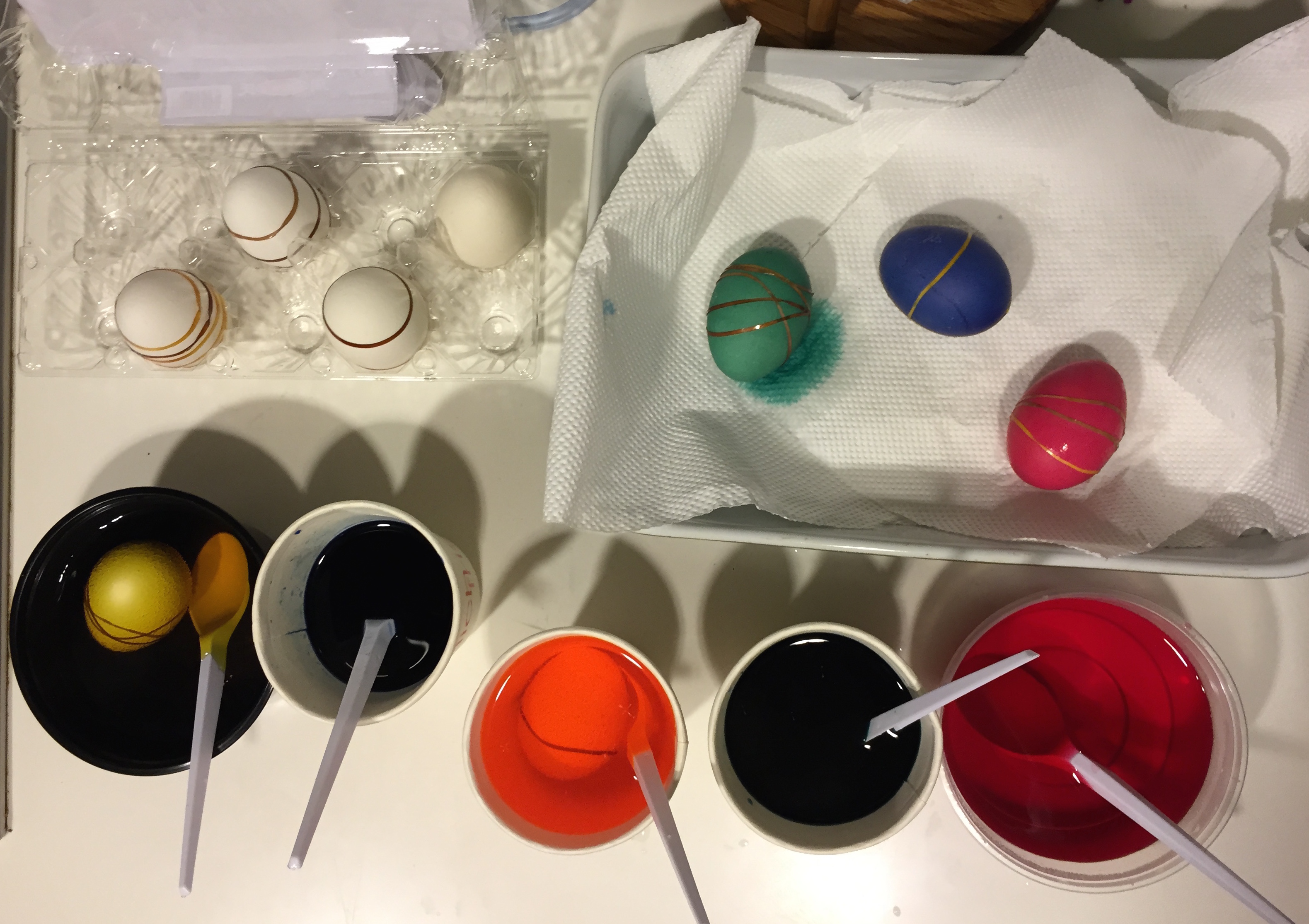 Während des Kochens kann man die Eierfarben vorbereiten. Es gibt verschiedene Möglichkeiten, aber meine Farbtabletten musste mit etwas Essig (1 EL) und kochendem Wasser angemischt werden. Dafür kann natürlich das Kochwasser der Eier verwendet werden. Nach dem Kochen die Eier wie gewohnt abschrecken um die “Pellbarkeit” zu erhöhen.