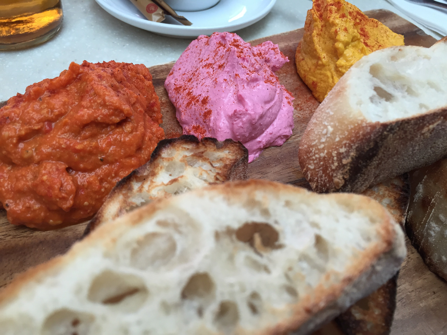 Nachdem wir also Auto los waren haben wir unsere Füße bemühen müssen und sind durch die Straßen und Parks von Sydney gelaufen. Schlussendlich sind wir dann am Darling Harbour gelandet. Da war an diesem Wochenende eine Art Familienfest, also einiges los. Darling Harbour ist kein wirklicher Hafen, sondern eine Vergnügungsmeile mit Restaurants, Kinos, Museen und Theatern, welche am Wasser liegt und mittels einer Brücke an das Stadtzentrum angeschlossen ist. Dort befand sich auch das Hard Rock Cafe von Sydney und dort haben wir obligatorische Souvenirs gekauft. Der kleine Hunger hat uns gefasst gehabt und wir sind in eines der besseren Restaurants, welches an der Hafenkante liegt, eingekehrt. Für mich gab es ein sehr leichtes geröstetes Sauerteigbrot, welches in Australien sehr beliebt ist, mit 3 verschiedenen Aufstrichen. Dabei handelte es sich um eine Salsa, einen Rote Beete Frischkäse und eine Eiersalat.