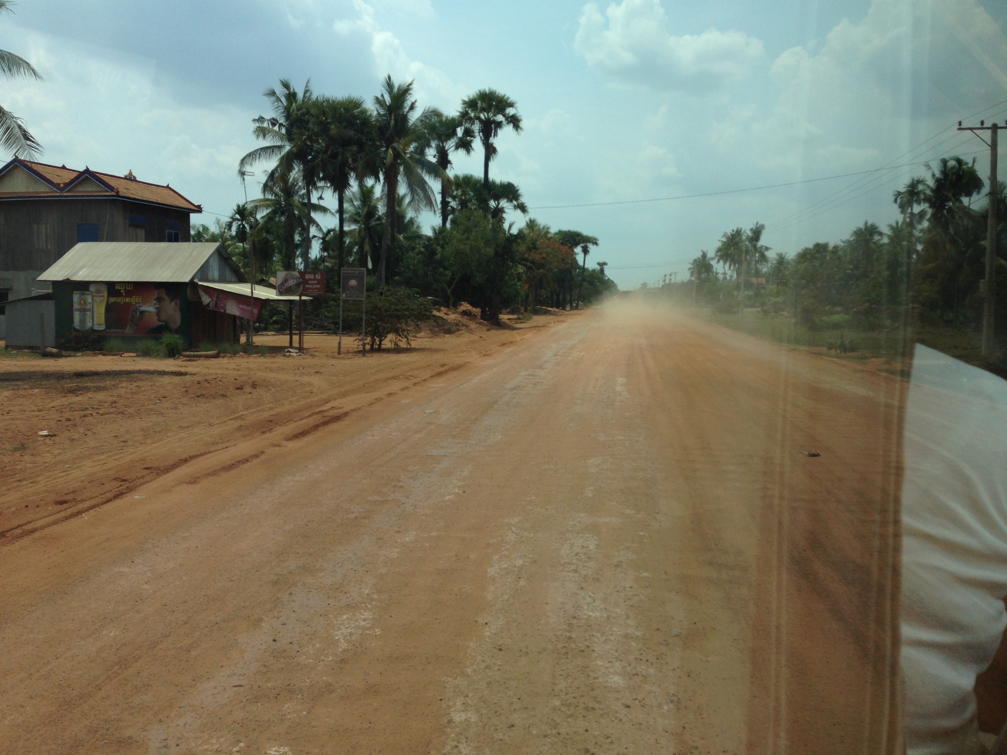 Am nächsten Tag sind wir von Phnom Penh nach Siem Reap gefahren um uns die Tempel des Angkor.Reiches anzuschauen. Dazu haben wir den komfortablen Giant Ibis Überlandbus genommen. Die Abholzeit vom Hotel wurde nicht direkt eingehalten, aber irgendwann ging es dann doch los. Die Fahrt dauerte rund 5 Stunden, verging im klimatisierten Bus aber recht schnell. Ein kleiner Zwischenstop an einem etwas fragwürdig aussehenden Restaurant entpuppte sich als gar nicht so schlimm. Die Straßenverhältnisse waren außerhalb von Städten, was dem Großteil der Strecke entsprach, eher etwas unterentwickelt. Auf der Schotterstraße wurden die Stoßdämpfer des Busses des Öfteren auf die Probe gestellt.