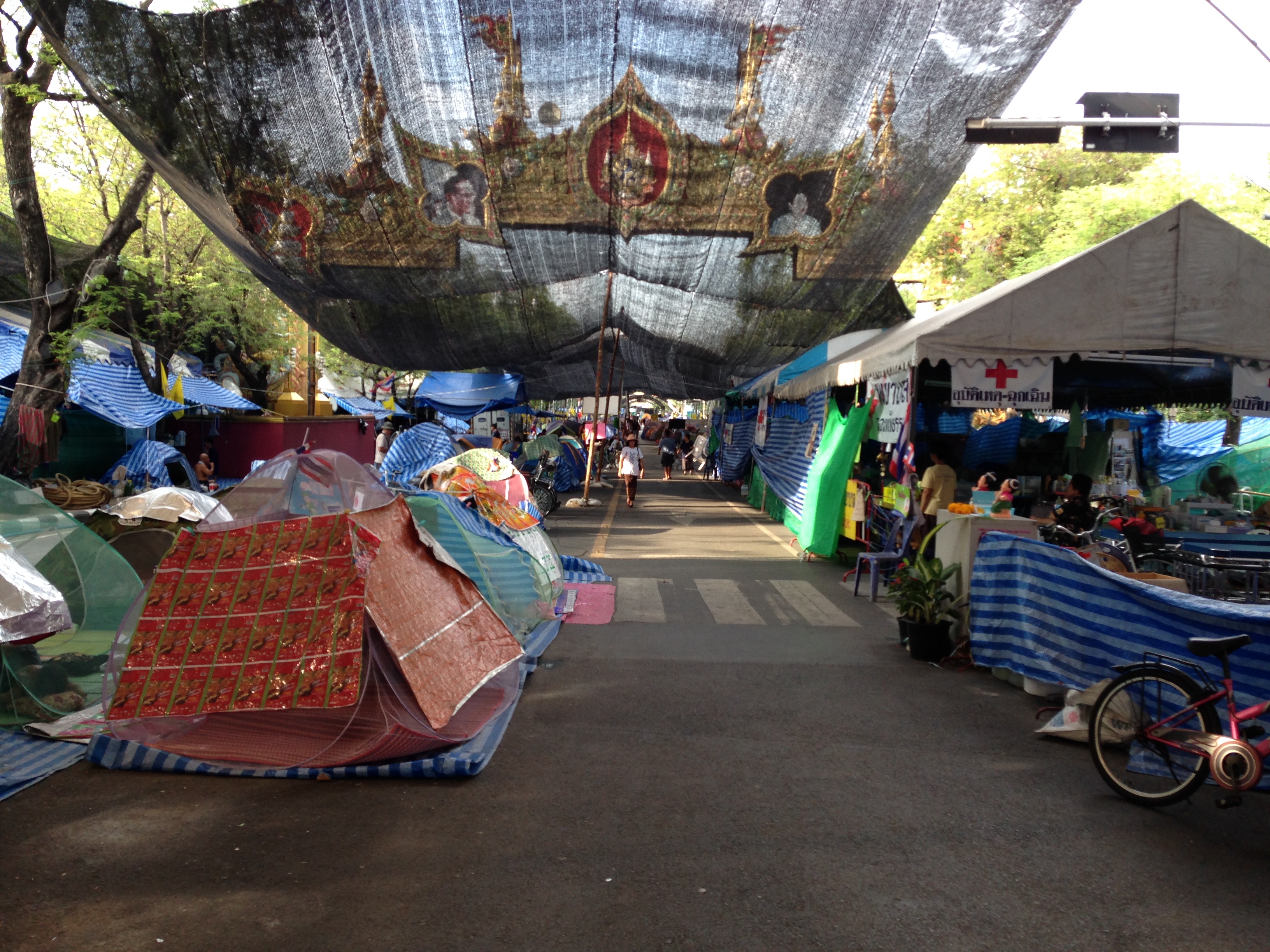 Wir sind trotzdem von unserem Hotel aus erstmal in eine Richtung gelaufen und haben die Stadt erkundet. Dabei sind wir auch mehr oder weniger zufällig durch eines der Straßenlager der Protestbewegung gelaufen. Dort haben die Regimegegner eine komplett überdachte Zeltstadt errichtet. Es gab sogar einen kleinen Markt, wo man sich mit Protestmaterial und Lebensmitteln eindecken konnte. Genauso gab es auch ein Krankenhaus und ein Apothekenzelt, welches für kleinere medizinische Probleme unter den Protestierenden ausgelegt war.